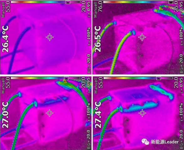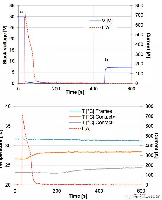對于液流電池最危險的短路情況就是,在電解液循環(huán)泵工作的情況下發(fā)生短路,并且沒有保險絲的保護,一般來說這種情況容易在電池組維護的過程中發(fā)生。A.H.Whitehead利用20串電池對這種情況進行了模擬,短路發(fā)生后電解液循環(huán)泵將繼續(xù)工作280s(一般而言,電池管理系統(tǒng)在發(fā)現(xiàn)短路后能夠在280s內(nèi)關(guān)閉電解液循環(huán)泵),測試結(jié)果如下圖所示,在短路的瞬間電池電流超過了700A,隨后短路電流下降到490A左右,并持續(xù)到電解液循環(huán)泵關(guān)閉,電池的熱成像儀圖像如下圖所示,電池溫度升高主要在正負極接線柱上,在整個測試過程中電池沒有發(fā)生泄漏、起火等。電池在短路測試后進行的電化學測試,也表明電池性能沒有受到短路的影響。