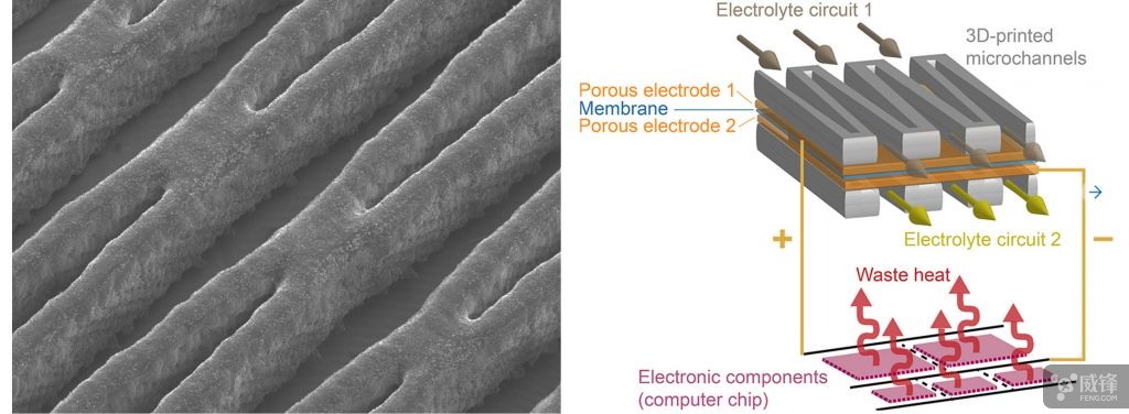 此前的液流電池通常都應(yīng)用在大規(guī)模能量存儲中,例如與風電場和太陽能發(fā)電廠組合使用。而把這項技術(shù)用在微型設(shè)備上目前還是首次。新型液流電池的輸出也達到了新突破,每平方厘米電池表面能產(chǎn)生 1.4 瓦特功率。即使減去將液體電解質(zhì)泵送到電池所需的功率,所得的凈功率密度仍為每平方厘米1瓦特。除此之外研究人員在實驗中發(fā)現(xiàn),電解質(zhì)液體實際上能夠冷卻芯片。它們散發(fā)的熱量多于電池產(chǎn)生的電能。開發(fā)團隊還使用 3D 打印技術(shù),建立了楔形微通道系統(tǒng)。