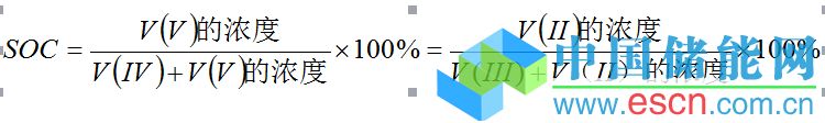 全釩氧化還原液流電池是用V(Ⅱ)/V(Ⅲ)和V(Ⅳ)/V(Ⅴ)氧化還原電對(duì)的硫酸溶液分別作正負(fù)半電池電解液的。完全放電態(tài)(即SOC=0):正半電池電解液為V(Ⅳ)的硫酸溶液,負(fù)半電池電解液為V(Ⅲ)的硫酸溶液;完全充電態(tài)(即SOC=1):正半電池電解液為V(Ⅴ)的硫酸溶液,負(fù)半電池電解液為V(Ⅱ)的硫酸溶液;其余的電荷狀態(tài)(即0<SOC<1),則正半電池為V(Ⅳ)和V(Ⅴ)的混合硫酸溶液,負(fù)半電池為V(Ⅱ)和V(Ⅲ)的混合硫酸溶液,依電荷狀態(tài)的不同,混合溶液中各自的比例不同。電荷狀態(tài)的計(jì)算見(jiàn)公式: