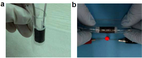 (b)柔性鋰離子電池在彎曲狀態(tài)下為發(fā)光二極管供電;