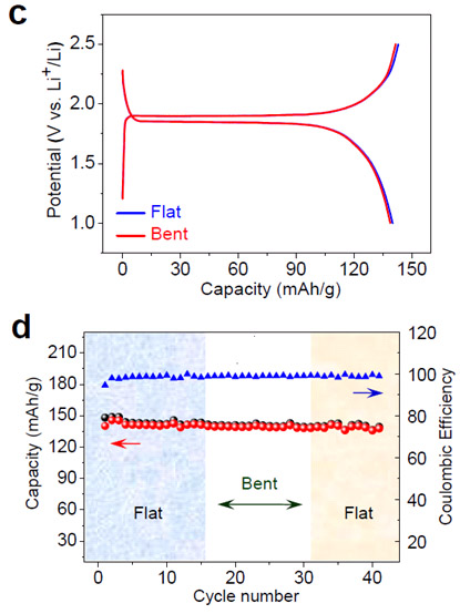 (c)和(d)分別為在彎曲與未彎曲狀態(tài)下柔性鋰離子電池的充放電曲線和循環(huán)性能圖,在彎曲狀態(tài)下電池的容量保持不變。
