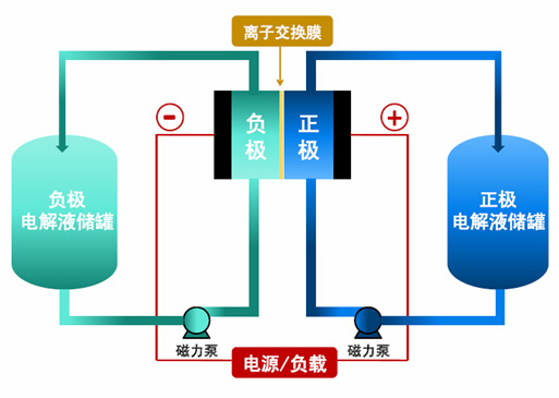 液流儲能電池是一種新型、高效的電化學(xué)儲能裝置。由原理圖可以看出,電解質(zhì)溶液(儲能介質(zhì))存儲在電池外部的電解液儲罐中,電池內(nèi)部正負極之間由離子交換膜分隔成彼此相互獨立的兩室(正極側(cè)與負極側(cè)),電池工作時正負極電解液由各自的送液泵強制通過各自反應(yīng)室循環(huán)流動,參與電化學(xué)反應(yīng)。充電時電池外接電源,將電能轉(zhuǎn)化為化學(xué)能,儲存在電解質(zhì)溶液中;放電時電池外接負載,將儲存在電解質(zhì)溶液中的化學(xué)能轉(zhuǎn)化為電能,供負載使用。