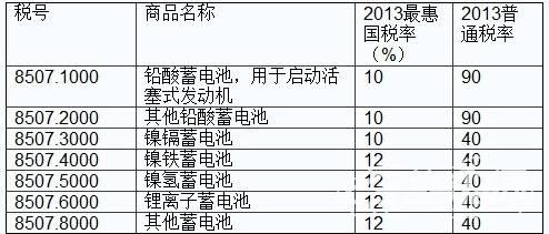 下圖為2013年我國鉛蓄電池進口關稅: