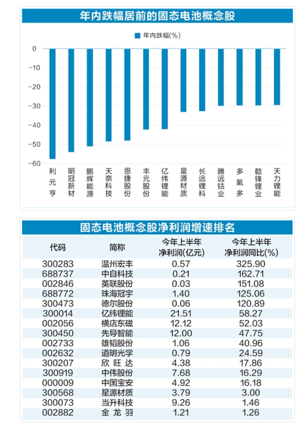 今年以來,由于新能源賽道整體降溫,固態(tài)電池概念整體表現(xiàn)也不盡如人意。證券時報·數(shù)據(jù)寶統(tǒng)計,今年以來,固態(tài)電池概念股平均下跌12.3%,跑輸同期上證指數(shù)。鵬輝能源、明冠新材、利元亨年內(nèi)跌超50%。