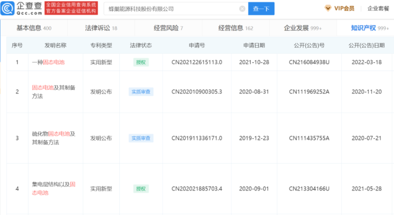 據(jù)悉,蜂巢能源固態(tài)電池和果凍電池(半固態(tài)電池)全球?qū)@矫嬉采暾?qǐng)了大量專(zhuān)利。