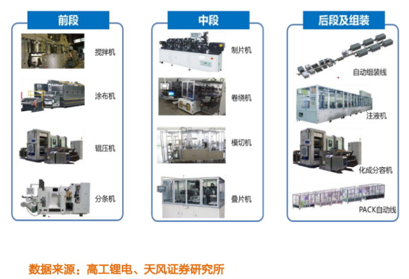 制造過程按順序可分為前段、中段、后段三個環(huán)節(jié)。簡單來講,前段就是正負極生產(chǎn)的過程,后段則是檢測組裝的環(huán)節(jié)。