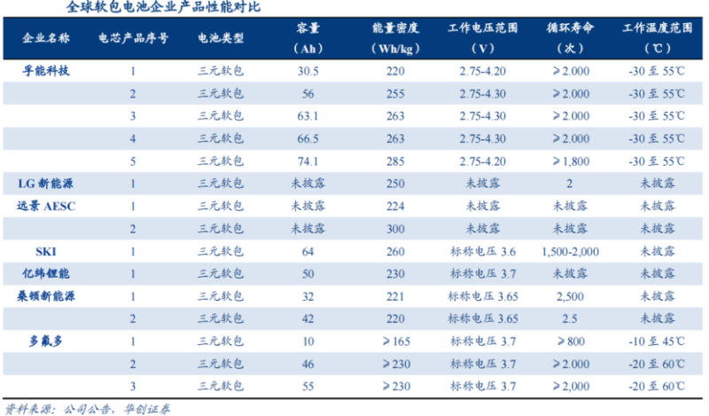 在液態(tài)電池領域,三元軟包是能量密度最高的技術。根據(jù)2021年4月的《自愿性披露新技術研發(fā)進展公告》,孚能科技研發(fā)成功的新一代動力電池,能量密度可達330Wh/kg,而其余廠家正在努力突破300Wh/kg。