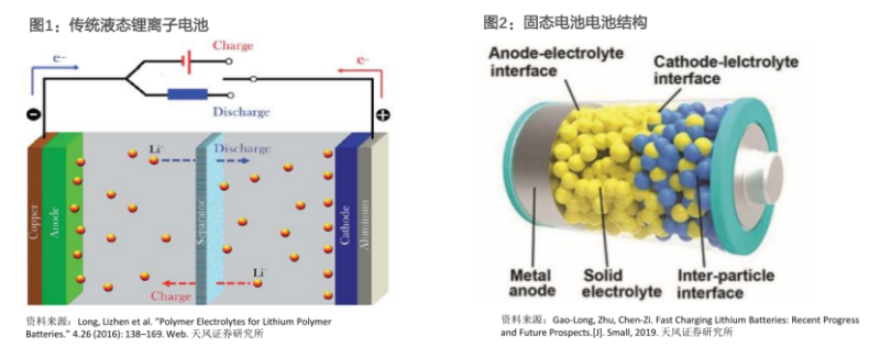 傳統(tǒng)鋰電池構成包括正極、負極、電解液、隔膜四大材料。而固態(tài)電池則將電解液和隔膜換成了固態(tài)電解質,其余類似。