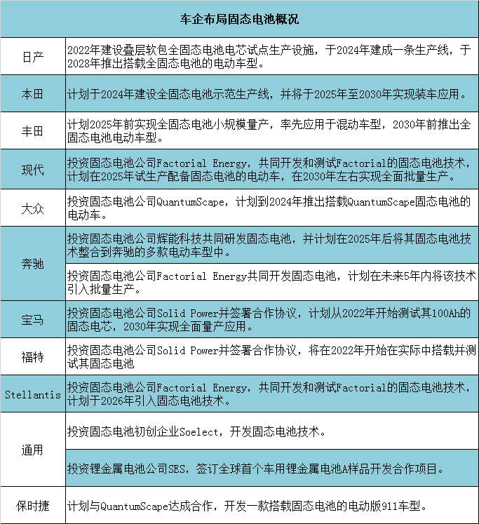 目前,包括大眾、奔馳、寶馬、Stellantis、福特、通用、現(xiàn)代等國際主機廠都在積極投資固態(tài)電池初創(chuàng)企業(yè),通過聯(lián)合開發(fā)的形式加快實現(xiàn)固態(tài)電池商業(yè)化。同時提供資金幫助被投資的固態(tài)電池企業(yè)建設廠房和擴充產(chǎn)能,并積極測試其固態(tài)電池樣品。