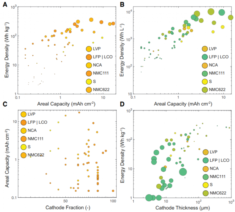 如圖5所示,SolidPAC可用于相關(guān)實驗參數(shù)的計算與預測,如陰極厚度、過量陽極含量、重量和體積能量密度(圖5)。圖5A和5B所示,重量和體積能量密度隨陰極面積容量的增加而增加,但與陰極化學無關(guān)。由于較大的SE厚度和低面積容量,大多數(shù)SSB的性能遠遠低于最新報道的鋰離子電池性能。然而,應注意的是,與體積能量密度相比,重量能量密度顯示出更大的度量偏差。這是因為不同形狀的SSB(扣式電池、壓力電池、Swagelok電池),具有不一樣的電池體積,這樣會導致更大的質(zhì)量能量密度偏差。此外,圖5C所示,活性材料的比重和面積容量之間的相關(guān)性也顯示出不均勻分布,表明在給定的復合陰極配方中,陰極面積負載(mg cm-2)和厚度(mm)的數(shù)值范圍通常都比較大。圖5D所示,可以清楚地觀察到,在較低的過量陽極和較高的陰極厚度,可以獲得較高的能量密度。