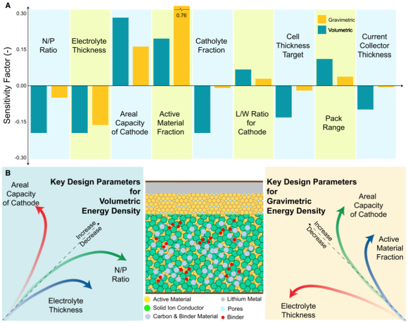 如圖4所示,研究人員使用公式圖片,對SolidPAC的靈敏度進行了分析,以便能夠調(diào)整電池相關(guān)參數(shù),獲得能量密度的最大化,其中Si為靈敏因子,EDfinal和EDinitial為擾動組和基態(tài)組的能量密度。對于質(zhì)量能量密度,活性物質(zhì)的含量是最敏感的因素,陰極的面積容量和電解質(zhì)厚度是重要的調(diào)整因素。相比之下,對于體積能量密度,陰極的面積容量是最敏感的因素,電解質(zhì)厚度、活性物質(zhì)分數(shù)、陰極電解質(zhì)分數(shù)和N/P比也顯示出高靈敏度。如圖4B所示,研究人員對一系列不同的材料組合進行了靈敏度分析,總體趨勢預期的結(jié)果一致。