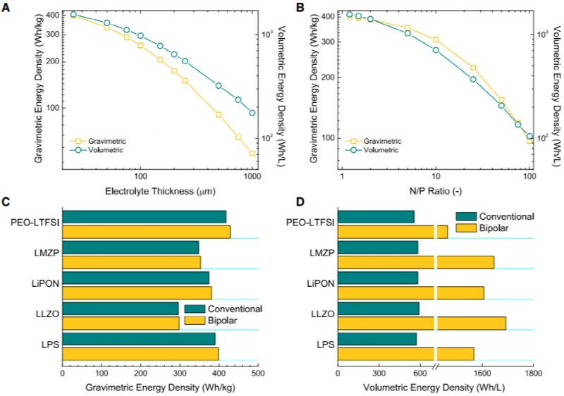 與傳統(tǒng)堆疊相比,雙極堆疊適用于SSB,因為SE可降低電解液泄漏和電池短路的風險。因此,陰極和陽極可以涂覆在同一個電池的兩側(cè),無需對單個電池進行單獨包裝和密封。由于減少了外部布線和集電器接線片,降低了電池的歐姆電阻,減少了封裝材料的使用,從而提高了雙極堆疊SSB的功率和能量密度。針對圖2C和2D所示的一系列化學反應,研究人員評估了堆疊結(jié)構(gòu)對電池級能量密度的影響。