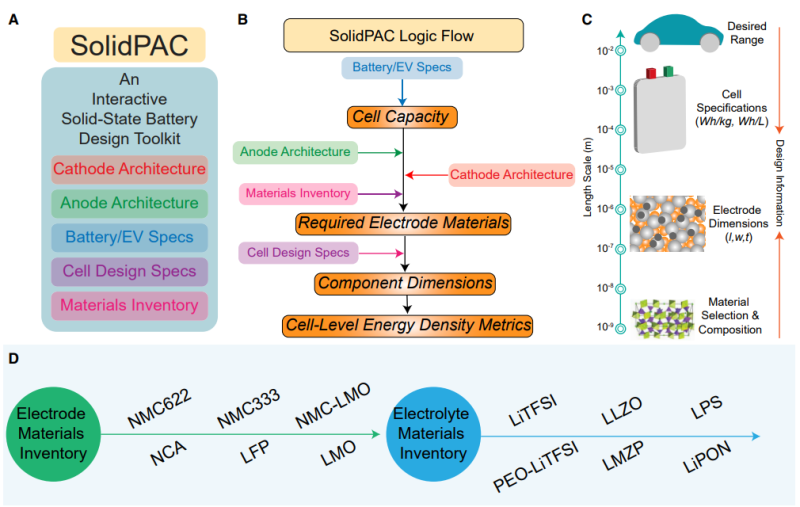 作為新一代具有高能量和高功率密度特征的固態(tài)電池,在可充電電池領(lǐng)域具有很好的應用前景。而確定新興電池能否滿足實際應用,達到與傳統(tǒng)鋰離子電池相當?shù)男阅?,能量密度這一性能指標至關(guān)重要。然而,現(xiàn)有的技術(shù)仍然無法全面的評估電池設(shè)計、電池組件與固態(tài)電池能量密度之間的內(nèi)在關(guān)系。基于此,美國橡樹嶺國家實驗室Ilias Belharouak等人介紹了一種可用于固態(tài)電池性能全面分析的交互式實驗工具包(SolidPAC)。該工具包可根據(jù)用戶特定的應用要求,設(shè)計出相應的固態(tài)電池,幫助研究人員對電極材料性能和組分、電極厚度和負載、成本等因素進行合理優(yōu)化,并利用逆向工程概念,將電池能量密度輸出與材料和電池設(shè)計輸入有效地關(guān)聯(lián)起來。
