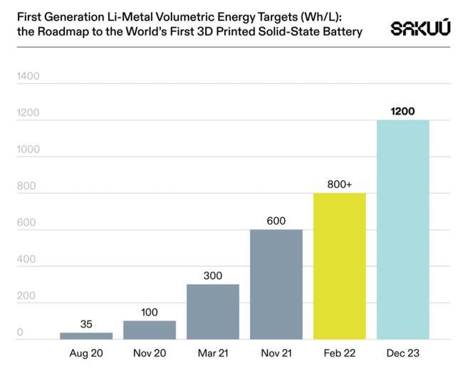 Sakuu稱,這一成就是實現(xiàn)在2023年制備超過1,200Wh/L的全3D打印固態(tài)電池(SSB)目標前的重要一步,所含有的能量密度遠遠高于當今市場領先的鋰電池。(目前市場常見的鋰電池的能量密度在500-700Wh/L范圍內(nèi)。)
