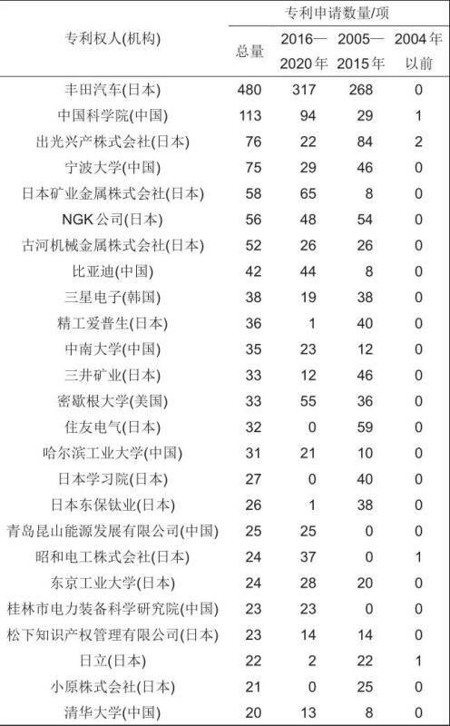 表3 全固態(tài)鋰電池技術(shù)專利權(quán)人(機(jī)構(gòu))及其專利申請時間分布情況
