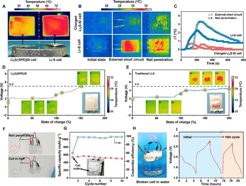 圖2. 基于硫化鋰正極與硅負極的全固態(tài)軟包電池安全性評價:(A)過熱、(B,C)內、外部短路、(D,E)過充、(F,G)空氣中穿刺剪切后充放電、(H,I)剪切浸水后充放電。