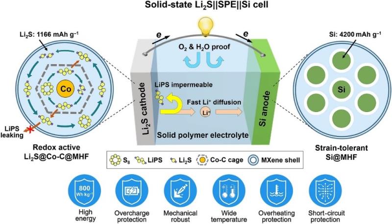 針對現有電池技術安全性與能量密度“魚與熊掌不能兼得”的瓶頸,王治宇、邱介山教授將硫化鋰正極與硅負極之間本質安全的多電子氧化還原反應與高可靠性的固態(tài)電池設計融合,發(fā)展了一類比能量520 Wh kg-1以上、兼具高安全性的全固態(tài)鋰二次電池新體系?;谶@一電池化學的軟包電池在過熱、內/外短路、機械損傷、過充及水/氧侵蝕等極端條件下仍可正常充放電;500小時無自放電,并可在-20至80oC的寬溫區(qū)內工作,具有良好的環(huán)境適應性。聯用原位X射線衍射、原位紫外-可見光譜、原位阻抗等先進譜學手段揭示了聚合物固態(tài)電解質中的多硫化物介導氧化還原反應機制與多硫化物穿梭抑制效應,發(fā)展了利用多級納米反應器增強固態(tài)電解質中硫化鋰正極反應活性、提升硅負極結構穩(wěn)定性的高效策略。此項工作為跨越現有電池技術安全性與能量密度之間的巨大鴻溝,發(fā)展高能量、高安全性、高環(huán)境適應性的“三高”電池技術開辟了新的方向,在載人交通工具、空間技術、植入醫(yī)療、軍事國防等對儲能技術安全性、可靠性需求突出的領域尤具應用前景。