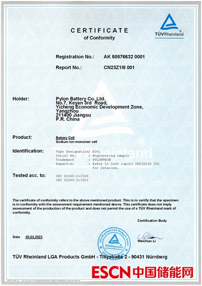 中國儲能網(wǎng)訊:3月3日,上海派能能源科技股份有限公司(以下簡稱派能科技)收到德國萊茵TüV集團(以下簡稱TüV萊茵)頒發(fā)的關(guān)于鈉離子電池認證證書,該證書為TüV萊茵頒發(fā)的全球首張鈉離子電池認證證書。