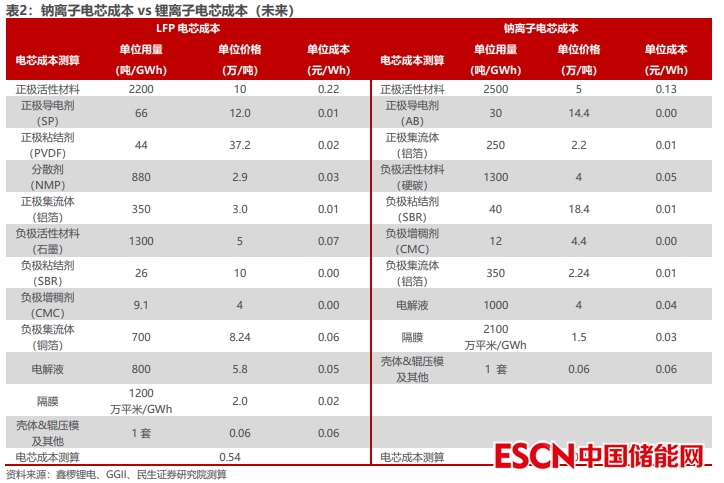 未來隨著碳酸鋰價(jià)格回落,鈉離子電池產(chǎn)業(yè)鏈成熟。假設(shè)碳酸鋰價(jià)格未來降低到 25 萬/噸左右,根據(jù)鑫欏鋰電,25 萬/噸的碳酸鋰對(duì)應(yīng)磷酸鐵鋰正極價(jià)格約10 萬/噸,鈉離子電池方面,我們假設(shè)鈉離子電池正極、負(fù)極產(chǎn)業(yè)鏈成熟后成本可降低 50%,根據(jù)測算,未來碳酸鋰價(jià)格回落, 鈉離子電池產(chǎn)業(yè)鏈成熟后,磷酸鐵鋰電芯的成本約 0.54 元/Wh,鈉離子電芯的成本約 0.33 元/Wh,鈉離子電芯成本低于磷酸鐵鋰電芯 0.21 元/Wh。