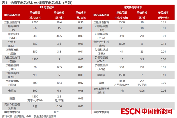 目前碳酸鋰價(jià)格高企,鈉離子電池尚未規(guī)?;a(chǎn),磷酸鐵鋰電芯的成本在0.75 元/Wh,鈉離子電芯的成本在 0.75 元/Wh,兩者基本持平。