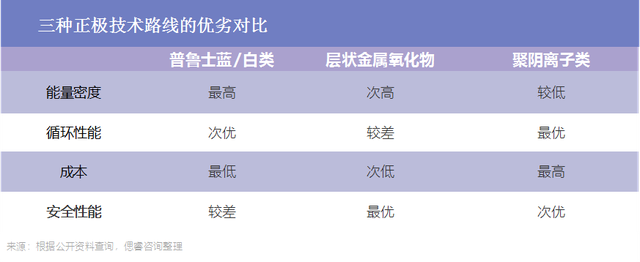 正極材料是影響電池能量密度、循環(huán)壽命等性能的決定因素。在目前行業(yè)中共有三種技術(shù)路線:過渡金屬氧化物(中科海鈉、鈉創(chuàng)新能源路線)、普魯士藍(lán)類化合物(寧德時(shí)代路線)和聚陰離子型化合物(眾鈉能源路線)。