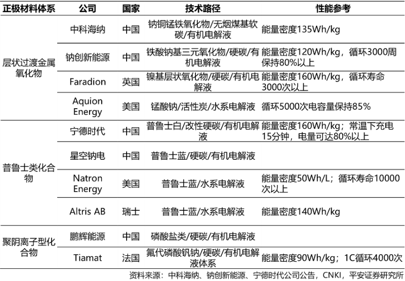 在中游電芯環(huán)節(jié),目前國(guó)內(nèi)外有超過二十家公司正在布局鈉離子電池產(chǎn)業(yè)化,我國(guó)一些企業(yè)在鈉電性能上已處于領(lǐng)先地位。海外的公司包括英國(guó)的Faradion,美國(guó)的Natron Energy、Aquion Energy,法國(guó)的Tiamat和瑞士的Altris AB,國(guó)內(nèi)的公司主要包括初創(chuàng)公司中科海鈉、鈉創(chuàng)新能源、星空鈉電和鋰電產(chǎn)業(yè)巨頭寧德時(shí)代。其中Faradion是全球首家從事鈉離子電池研究的公司,成立于2011年,采用鎳基層狀氧化物/硬碳/有機(jī)電解液技術(shù)路線,能量密度高達(dá)160Wh/kg,循環(huán)壽命3000次以上;中科海鈉是國(guó)內(nèi)首家專注于鈉離子電池研發(fā)的公司,成立于2017年,采用鈉銅錳鐵氧化物/無煙煤基軟碳/有機(jī)電解液技術(shù)路線,能量密度超過135Wh/kg;國(guó)內(nèi)另一家技術(shù)較為領(lǐng)先的初創(chuàng)公司鈉創(chuàng)新能源成立于2018年,采用鐵酸鈉基三元氧化物/硬碳/有機(jī)電解液技術(shù)路線,能量密度120Wh/kg,循環(huán)3000周保持80%以上;寧德時(shí)代從2015年開始研發(fā)鈉離子電池,2021年7月推出第一代鈉離子電池,采用普魯士白/改性硬碳/有機(jī)電解液技術(shù)路線,能量密度160Wh/kg,常溫下充電15分鐘,電量可達(dá)80%以上。各公司采用的材料體系和工藝均有差異,其中以普魯士白為正極材料的寧德時(shí)代和以層狀氧化物為正極材料的Faradion和中科海鈉,在電池性能上兼具較高的能量密度和循環(huán)壽命。另一方面,幾乎所有的初創(chuàng)公司技術(shù)來源于實(shí)力較強(qiáng)的科研院所團(tuán)隊(duì),像鈉電這種新技術(shù)驅(qū)動(dòng)型的行業(yè),需要較強(qiáng)的技術(shù)研發(fā)實(shí)力和工程化能力,才有機(jī)會(huì)把鈉電推向量產(chǎn)。當(dāng)下的鈉離子電池處于產(chǎn)業(yè)化早期,材料和工藝上有優(yōu)化空間,競(jìng)爭(zhēng)格局未定,有技術(shù)實(shí)力和工程化能力的新入局者依然有較大的發(fā)展機(jī)會(huì)。各公司選用的材料體系及性能參數(shù)如下: