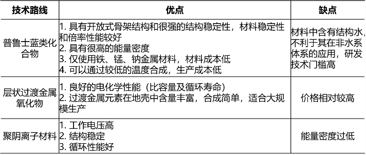 正極材料的作用是給電池提供離子源,決定了電池的能量密度和成本,因此選擇合適的正極材料是鈉離子電池走向商業(yè)化的關(guān)鍵。目前正極材料的主要路線有四種:過渡金屬氧化物、普魯士化合物(鐵氰化物)、聚陰離子型化合物(磷酸鹽或硫酸鹽)和非晶態(tài)材料,其中過渡金屬氧化物和普魯士化合物是產(chǎn)業(yè)化嘗試較多的兩類材料,比容量可達(dá)160mAh/g,與現(xiàn)有的磷酸鐵鋰電池正極材料相當(dāng)。