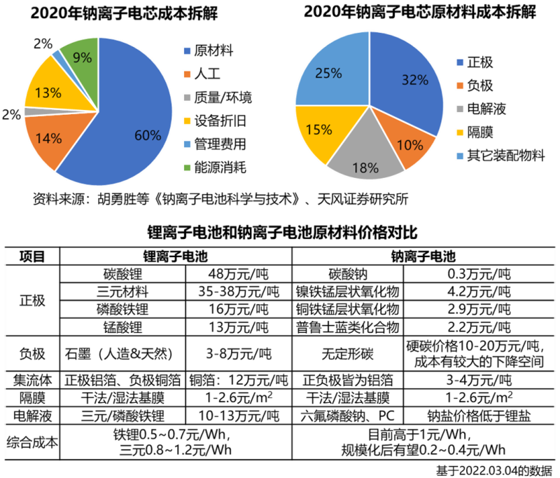 電芯成本結(jié)構(gòu)主要包含原材料、人工制造、設(shè)備折舊、能源消耗、環(huán)境和管理費(fèi)用等,其中原材料成本占電芯成本的60%左右;原材料又可以進(jìn)一步拆分成正極、負(fù)極材料(包括導(dǎo)電劑、黏結(jié)劑和鋁箔)、電解液、隔膜和其它裝配部件,鈉離子電池各原材料的成本占比如下圖所示。據(jù)測(cè)算,正極分別為銅鐵錳層狀氧化物、普魯士白類和鎳鐵錳層狀氧化物時(shí)的BOM成本分別為0.26元/Wh、0.29元/Wh和0.31元/Wh,比磷酸鐵鋰(0.5-0.7元/Wh)和三元鋰電(0.8-1.2元/Wh)的成本有較大的降低。