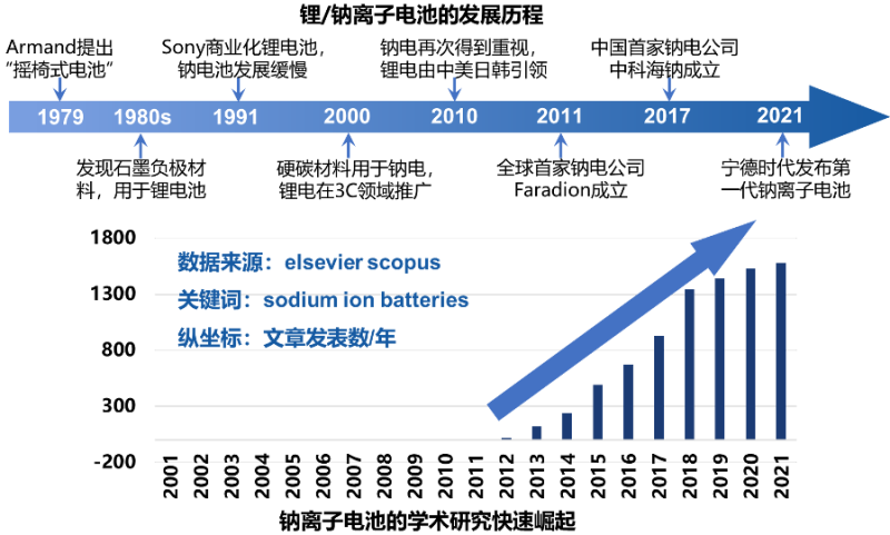 鈉離子電池的研究起源于1979年法國(guó)Armand提出的“搖椅式電池”,與鋰離子電池的研究同時(shí)期起步。然而在80年代末期,石墨基負(fù)極材料的應(yīng)用讓鋰電的高容量和電化學(xué)活性表現(xiàn)出來,鈉電的性能卻表現(xiàn)較差,因此科研人員的注意力迅速聚焦在鋰離子電池上。鋰離子電池在幾年內(nèi)飛速發(fā)展,Sony公司在1991年率先實(shí)現(xiàn)了鋰離子電池的商業(yè)化,較高的能量密度和較長(zhǎng)的循環(huán)壽命也使其在消費(fèi)電子領(lǐng)域的應(yīng)用迅速推廣,相應(yīng)的產(chǎn)業(yè)鏈也在后續(xù)十多年后逐步完善。相比而言,鈉離子電池由于沒有適合的負(fù)極材料,其發(fā)展在隨后的十幾年中非常緩慢,甚至一度接近真空。直到2000年,科研人員找到硬碳這種適合鈉離子電池的負(fù)極材料,才使得鈉離子電池的發(fā)展迎來了轉(zhuǎn)折。尤其是在2010年后,鈉離子電池的研究成果迎來了井噴式增長(zhǎng),產(chǎn)業(yè)化進(jìn)程也不斷被推進(jìn)。全球第一家鈉離子電池公司Faradion成立于2011年,沿用了鋰離子電池常用的非水系電解質(zhì)。隨后全球多家鈉離子電池初創(chuàng)公司紛紛成立,也采用非水系電解質(zhì),包括法國(guó)的Tiama,中國(guó)的中科海鈉和瑞典的Altris AB,但是技術(shù)路線各異;而美國(guó)的Natron Energy則采用水系電解質(zhì),安全性更高。當(dāng)下鈉離子電池行業(yè)處于發(fā)展初期,面對(duì)新能源行業(yè)不同的應(yīng)用場(chǎng)景,群雄逐鹿對(duì)于鈉離子電池商業(yè)化有促進(jìn)意義。近年來,鋰離子電池產(chǎn)業(yè)巨頭也開始紛紛布局鈉離子電池技術(shù)。2021年7月,寧德時(shí)代發(fā)布了第一代鈉離子電池,吹響了鈉離子電池產(chǎn)業(yè)化的號(hào)角。未來隨著電池性能不斷被優(yōu)化,產(chǎn)業(yè)鏈逐步完善,鈉離子電池大規(guī)模走進(jìn)新能源應(yīng)用也指日可待。