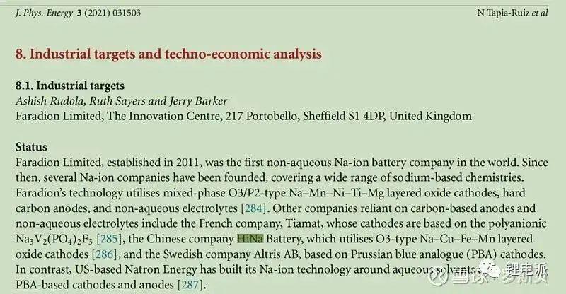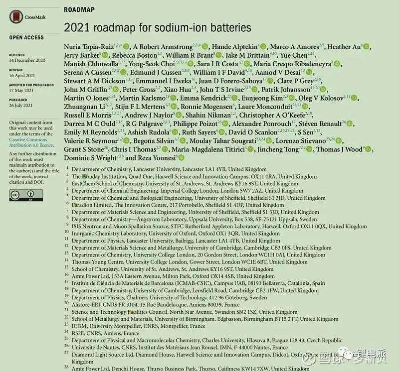 圖5 英國蘭卡斯特大學(xué)/劍橋大學(xué)/Faradion鈉離子電池公司等多個(gè)機(jī)構(gòu)的科學(xué)家聯(lián)合撰寫的論文《2021年鈉離子電池的路線圖》