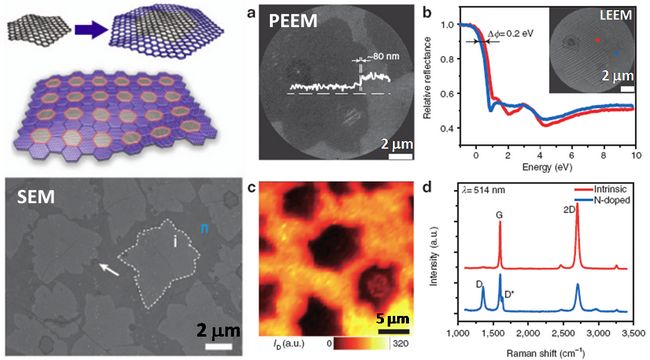 石墨烯在光電技術(shù)等領(lǐng)域有潛在的重要應(yīng)用,而構(gòu)建P-N結(jié)是實(shí)現(xiàn)許多光電器件應(yīng)用的核心,因此構(gòu)建石墨烯的光電功能器件必須在保證石墨烯質(zhì)量的前提下,實(shí)現(xiàn)高可控性和均一性的穩(wěn)定摻雜。北京大學(xué)化學(xué)與分子工程學(xué)院劉忠范-彭海琳課題組根據(jù)材料生長(zhǎng)中調(diào)制摻雜的原理,提出了具有高遷移率、摻雜區(qū)域可控的石墨烯的調(diào)制摻雜生長(zhǎng)方法,實(shí)現(xiàn)了“馬賽克”結(jié)構(gòu)的石墨烯P-N結(jié)材料的規(guī)模制備,并將其用于高性能光電轉(zhuǎn)換器件。由于對(duì)石墨烯進(jìn)行氮攙雜能夠有效降低表面功函數(shù),其與本征石墨烯區(qū)域在PEEM成像中具有較大的襯度差異,因此PEEM可以作為一個(gè)有效的表面研究方法表征具有此類結(jié)構(gòu)的石墨烯表面。