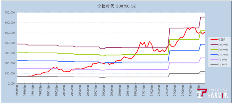 考慮到公司未來的成長性,我們用PEG方法對(duì)公司股價(jià)進(jìn)行一下分析,可以看到公司PE(TTM)從2020年以來保持了快速的增長,目前PE較7月份有所下降,目前在144左右,公司2021年上半年凈利潤增速為148.38%, 如果僅是根據(jù)上半年凈利潤增速來看,PEG小于1,以目前凈利潤的增速是對(duì)股價(jià)有支撐的,但是考慮到未來三五年內(nèi)公司凈利潤維持如此高的增速基本是很困難的,這也就說明市場(chǎng)目前對(duì)公司的估值其實(shí)是相當(dāng)樂觀的,或許寧德時(shí)代已經(jīng)考慮到這一點(diǎn),而目前積極開發(fā)鈉電池,尋找新的利潤增長點(diǎn)正是主要的應(yīng)對(duì)措施之一。