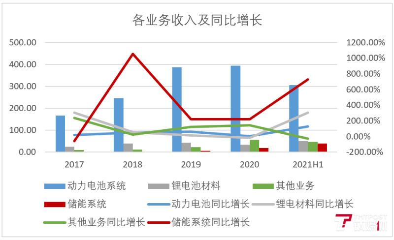 作為拉動(dòng)營收增長主要的動(dòng)力電池系統(tǒng)業(yè)務(wù)部分,雖然2021年上半年收入有較大幅度增長,但其對(duì)營收的貢獻(xiàn)比例下降至69.09%, 鋰電材料與儲(chǔ)能系統(tǒng)對(duì)營收貢獻(xiàn)率均超過10%。