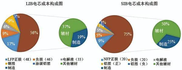圖1 鋰離子電池電芯(以磷酸鐵鋰電池2019年上半年成本計算)和相應(yīng)的鈉離子電池電芯各組成價格比率對比圖