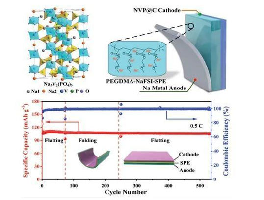 據(jù)介紹,該電池可以在0.5C倍率下穩(wěn)定循環(huán)740次,且每次的容量衰減率僅為0.007%;該電池擱置3個月后,容量保留率仍高達(dá)95%,這表明自放電率極低;軟包鈉離子電池在平鋪和彎折狀態(tài)下循環(huán)535次后,仍可提供高達(dá)355Wh/kg的能量密度(基于正極材料質(zhì)量計算)。該團(tuán)隊的設(shè)計策略及研究成果,為高比能柔性全固態(tài)鈉電池的發(fā)展和應(yīng)用提供了新方向。