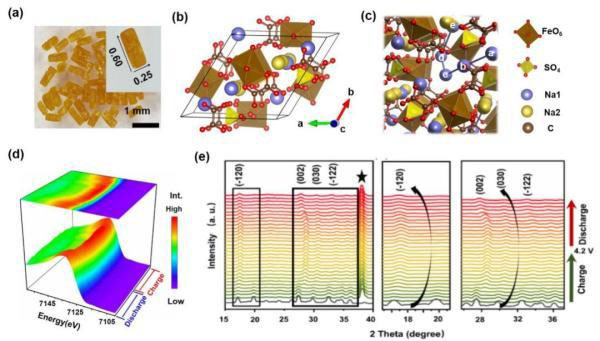 圖:新型鈉離子正極材料。(a) 單晶材料,晶體結(jié)構(gòu)解析(b)和鈉離子擴(kuò)散路徑示意圖(c),充放電過(guò)程中的同步輻射近邊X射線吸收譜(d)和原位XRD譜(e)。