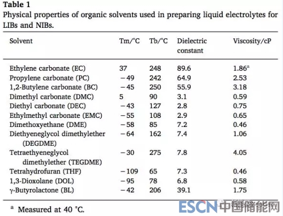 下表為常見的有機(jī)溶劑的物性參數(shù),從表中我們能夠注意到環(huán)狀溶劑,例如EC和PC具有較高的介電常數(shù),但是粘度也比較大,而線狀溶劑,例如DMC和DEC等介電常數(shù)比較低,但是粘度比較低,因此為了同時(shí)滿足較高的介電常數(shù)和較低的粘度的要求,在鋰離子電池中環(huán)形溶劑和線形溶劑通常會(huì)混合使用,Ponrouch等人的研究則進(jìn)一步顯示將碳酸脂類溶劑與醚類溶劑混合使用能夠獲得更好的電導(dǎo)率和更好的循環(huán)性能,因此通常Na離子電池的電解液也需要多種溶劑混合使用。