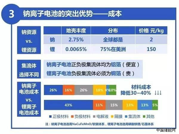 該體系選用資源豐富的鈉作為活性元素,正負(fù)極材料分別選用成本低廉的鈉銅鐵錳氧化物和無煙煤基軟碳,從而具備了明顯的成本優(yōu)勢。目前鈉離子電池的能量密度已達(dá)到120瓦時/公斤,是鉛酸電池的3倍左右。低成本鈉離子電池有望在低速電動車、電動船、家庭儲能、電網(wǎng)儲能等領(lǐng)域獲得應(yīng)用。
