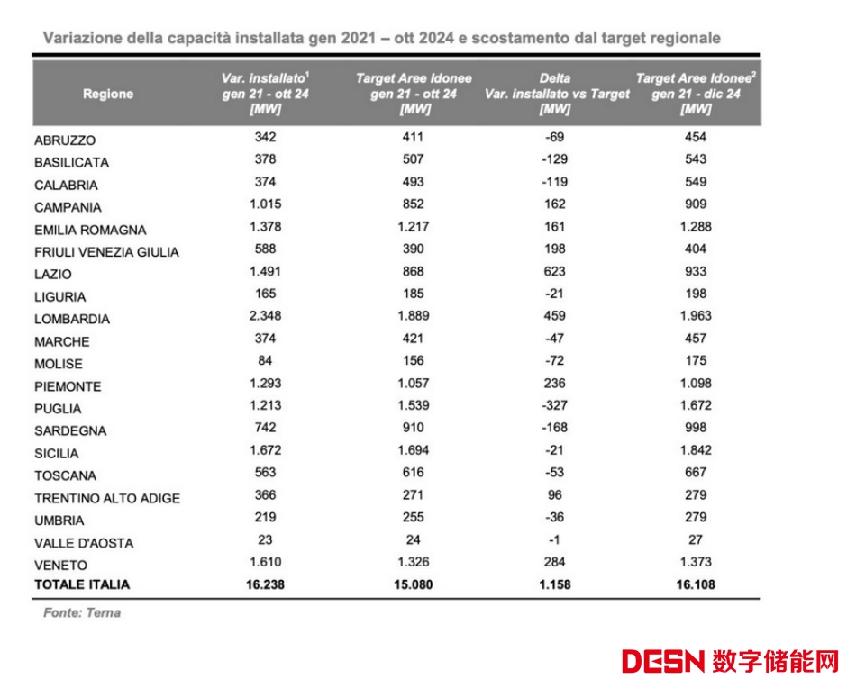 Terna公司表示,將新增的可再生能源發(fā)電項(xiàng)目裝機(jī)容量與意大利政府設(shè)定的可再生能源國家目標(biāo)(16,108MW)進(jìn)行比較,在2024年已經(jīng)提前兩個月實(shí)現(xiàn),因?yàn)樵诤线m的地區(qū)已經(jīng)開發(fā)和部署了16,238MW可再生能源發(fā)電設(shè)施。