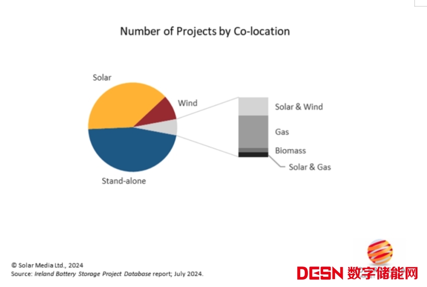 圖3愛爾蘭大約一半的儲能項目是獨立部署的儲能系統(tǒng),其余的項目主要是與太陽能發(fā)電場共同部署。