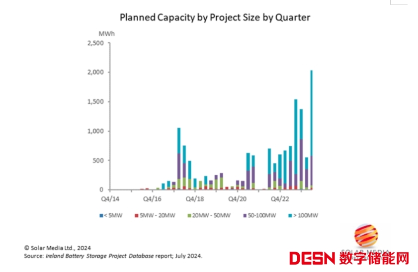 圖1顯示了愛爾蘭的儲能部署規(guī)模,2015年到2024年上半年提交的儲能部署規(guī)劃為14.41GWh。
