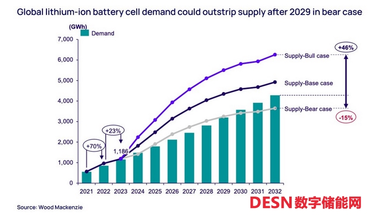 然而,從長遠來看,全球電池需求將會大幅增長。Wood Mackenzie公司估計,到2032年,全球每年電池需求量將超過4TWh。其中絕大多數(shù)(84%)將來自電動汽車,只有9%來自儲能系統(tǒng)??傮w而言,全球的電池供應(yīng)能夠滿足需求,盡管在市場看跌的情況下,原材料供應(yīng)放緩可能會在2029年之后引發(fā)供應(yīng)問題(見圖1)。