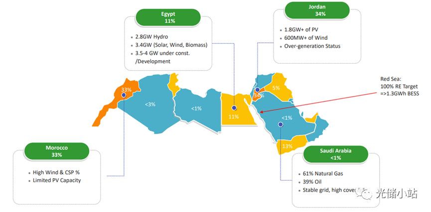 目前MENA可再生能源發(fā)電市場已初具規(guī)模,截至2022年底,約旦在運營的的光伏和風力發(fā)電約為2.4GW(占比34%),摩洛哥光伏風電發(fā)電占比為33%,埃及可再生能源發(fā)電裝機+在建項目為10GW,沙特紅海地區(qū)的可再生能源規(guī)劃中儲能裝機計劃達到了1.3GWh。