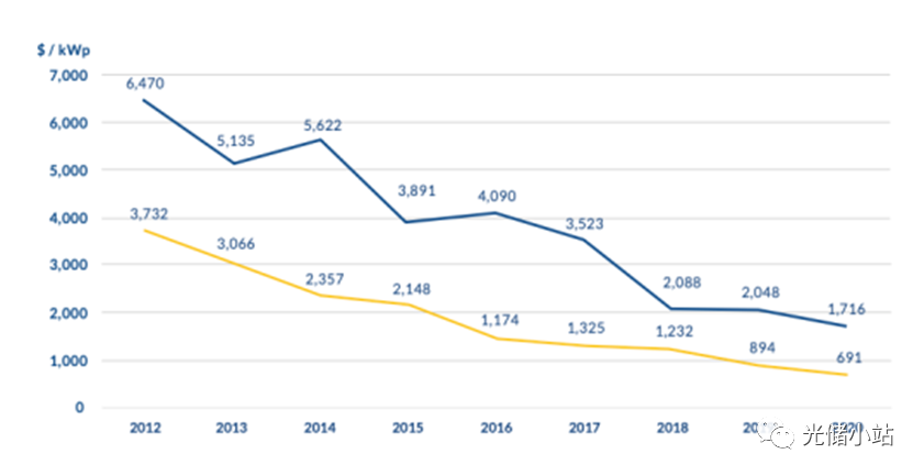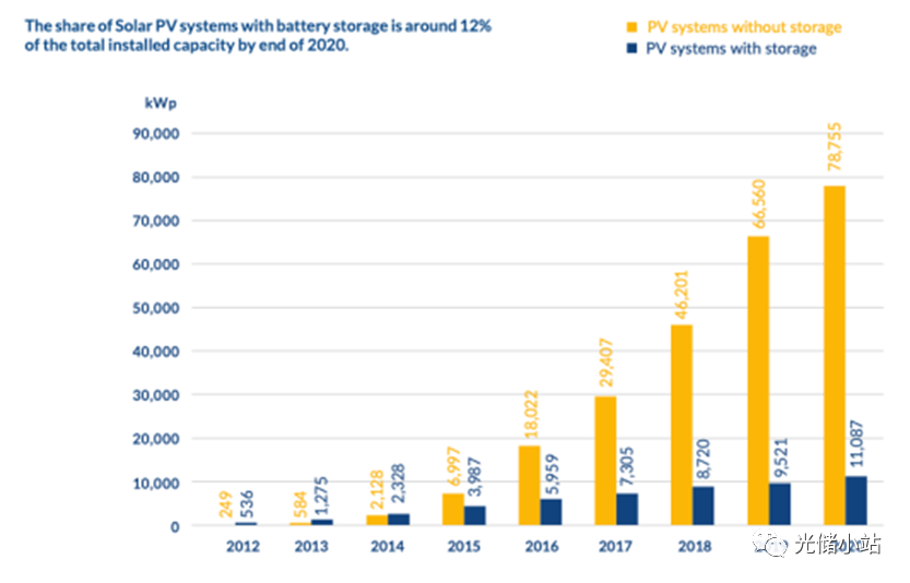 以黎巴嫩為例,其光伏配儲率隨著其光儲系統(tǒng)價格的下降而不斷上升,2020年黎巴嫩的光伏配儲率達到了12%,共有11,087kWp光伏配備了儲能系統(tǒng)。