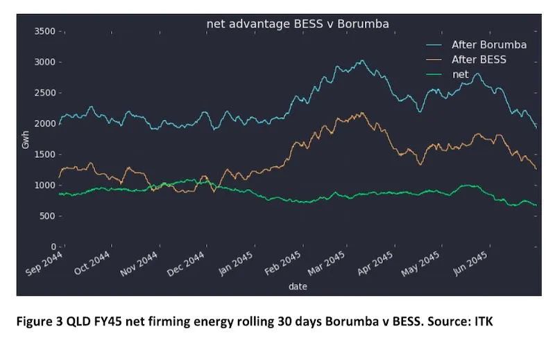 基本上,我將 Borumba 的性能與 6GW/8 小時 BESS 的性能進行了比較,方法是查看在運行筆者正在建模的任何儲能資產(chǎn)之后對堅強的剩余需求。無論是筆者還是其他任何人都沒有暗示 Borumba 可以單獨提供昆士蘭脫碳電力供應所需的所有堅強容量。