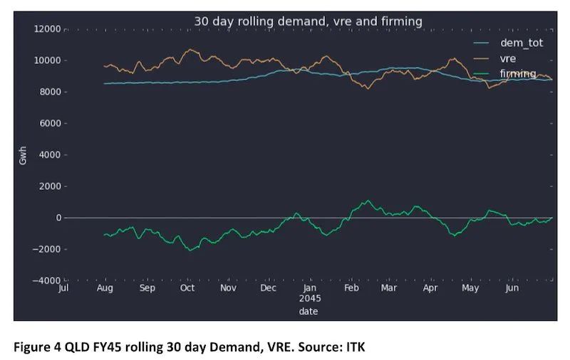 結(jié)果表明,這些資產(chǎn)通常是空的或滿的,因為在 ISP 看來,昆士蘭一旦在 2040 年左右達到 100% 的 VRE 供應,就需要超過 48GWh 的儲能和超過 6GW 的穩(wěn)固(Firming)功率。