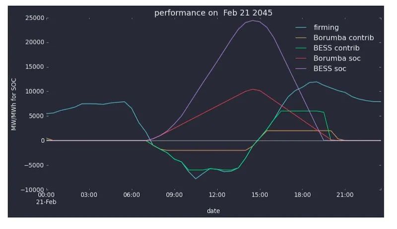 BESS 在早上的表現(xiàn)不太好,可能是因為它在很多天都是空的,但即便如此,因為它可以以 6GW 而不是 2GW 的速度充電,它仍然比 Borumba 做得更好。