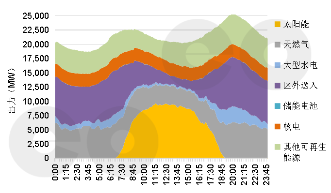 CAISO太陽能發(fā)電年利用小時在2000-2300h,與我國新疆、內(nèi)蒙古地區(qū)相當(dāng)。圖6為夏季和春季典型日風(fēng)電、太陽能出力曲線。太陽能日間出力在11時-13時達(dá)到最大,夏季峰值能達(dá)到裝機(jī)容量的80%,春季峰值為裝機(jī)容量的70%左右。從季節(jié)來看,夏季出力維持在峰值附近的時長大于春季。從太陽能出力占負(fù)荷的比例看,2020年3月太陽能出力峰值接近1000萬千瓦,約占負(fù)荷的48%,夏季出力峰值約占負(fù)荷的39%。