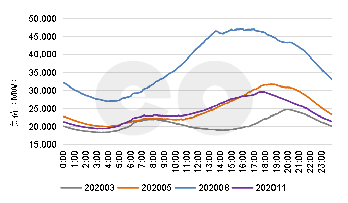 由于屋頂光伏不斷增長抵消了部分負(fù)荷,近年來CAISO負(fù)荷峰值未明顯增長。圖7為各季節(jié)負(fù)荷曲線。年度負(fù)荷峰值出現(xiàn)在夏季,2020年夏季峰值為4712萬千瓦,其余季節(jié)約3000萬千瓦。日間負(fù)荷在16-20時達(dá)到最大,日峰谷差約2000萬千瓦(夏季)、1100萬千瓦(非夏季)。