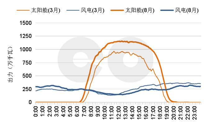 風(fēng)電日間出力在22時-23時達(dá)到最大,夏季峰值能達(dá)到裝機(jī)容量的54%,春季峰值為裝機(jī)容量的62%。春季出力峰值為360萬千瓦。地?zé)岷蜕镔|(zhì)發(fā)電日間出力較穩(wěn)定,約為170萬千瓦。